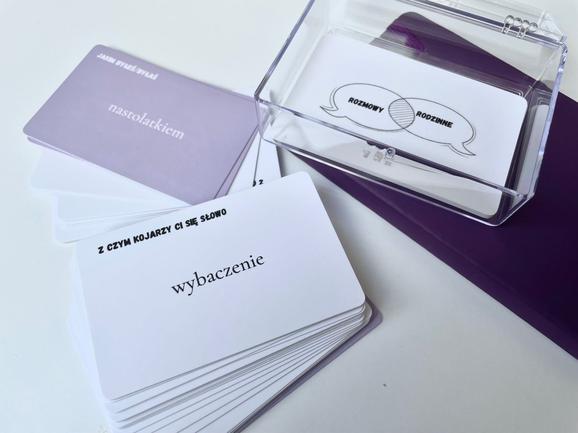 Karty zostały stworzone z myślą o nastolatkach i ich rodzicach. To łącznie 40 pytań, które pomogą zadbać o relację i poznać się lepiej. Od pytań, wydawało by się, że banalnych, po takie, które być może nigdy sobie nie zadaliście. Sprawdzą się także podczas indywidualnych spotkań z nastolatkiem, by lepiej poznać jego i jego potrzeby, a także określić cele do pracy (przetestowane również w pracy grupowej).