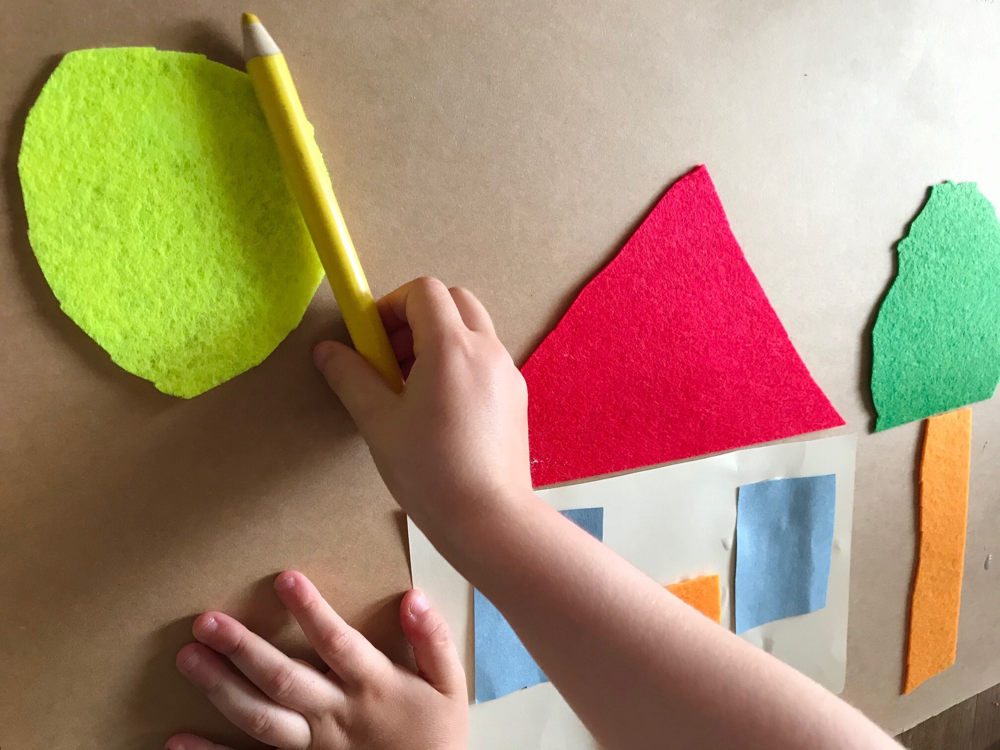 Od czego zacząć? Najpierw wycinamy różne kształty z filcu i bloku rysunkowego. W bloku rysunkowym ze wzorami znalazłam psy i koty, więc je również wycięłam. Jeśli chodzi o kształty to u nas były to dwa obrazki: DOM i KOSMOS. Na zdjęciach możecie podpatrzeć jakich kształtów będziecie potrzebować.