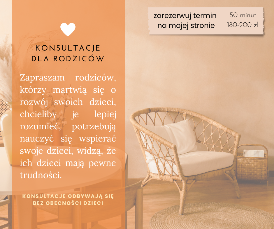 Konsultacja to 50 minutowa rozmowa, która odbywa się bez obecności dziecka. Celem spotkania jest zebranie wywiadu, określenie potrzeb rodziny, rozpoznanie problemów oraz ewentualne zaplanowanie dalszego procesu pomocowego.