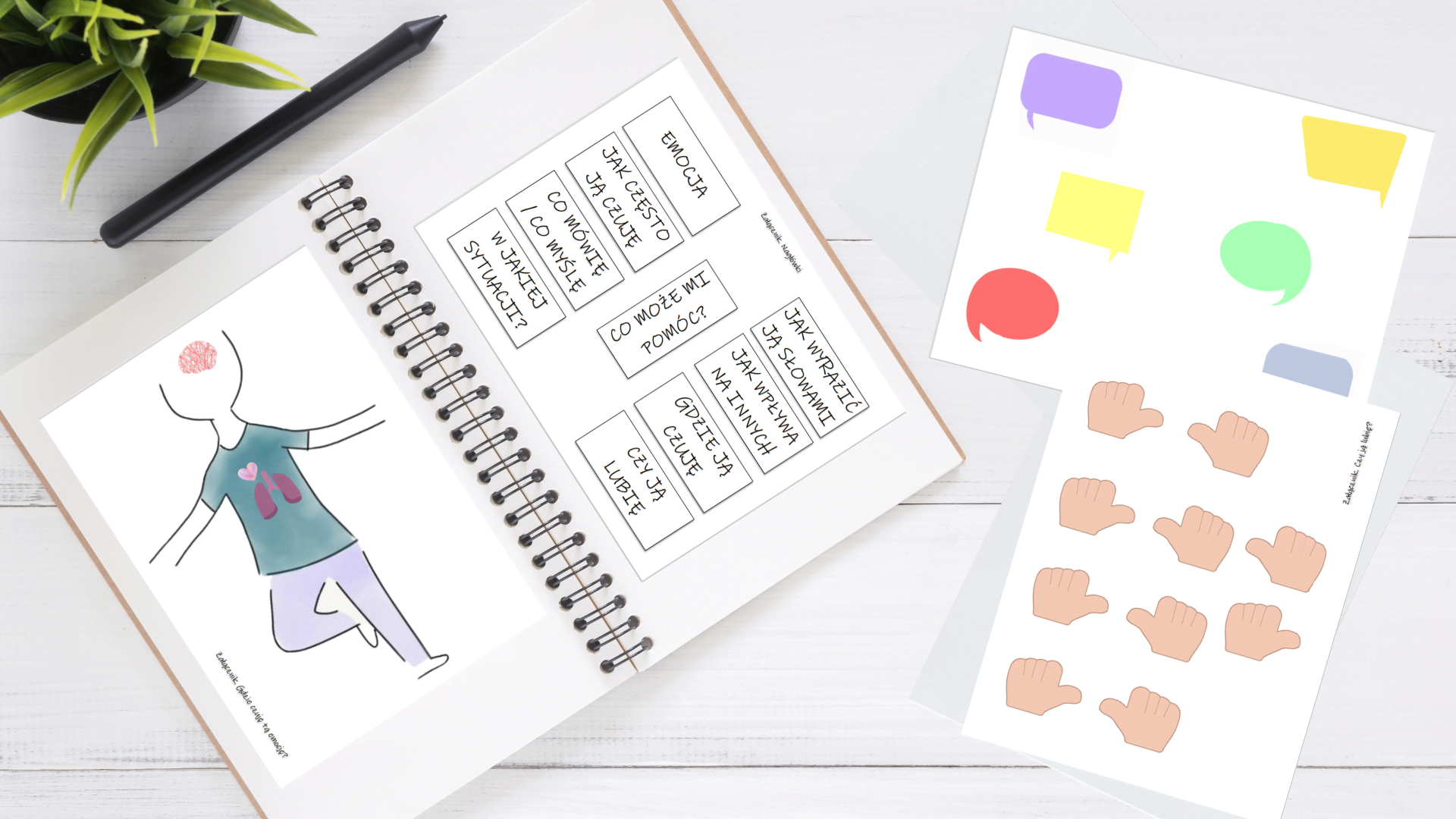 W zestawie znajdują się nazwy emocji, nagłówki oraz elementy graficzne. Zestaw ten idealnie sprawdza się w pracy w obszarze emocji. Jego celem jest przede wszystkim nauka rozpoznawania emocji u siebie.